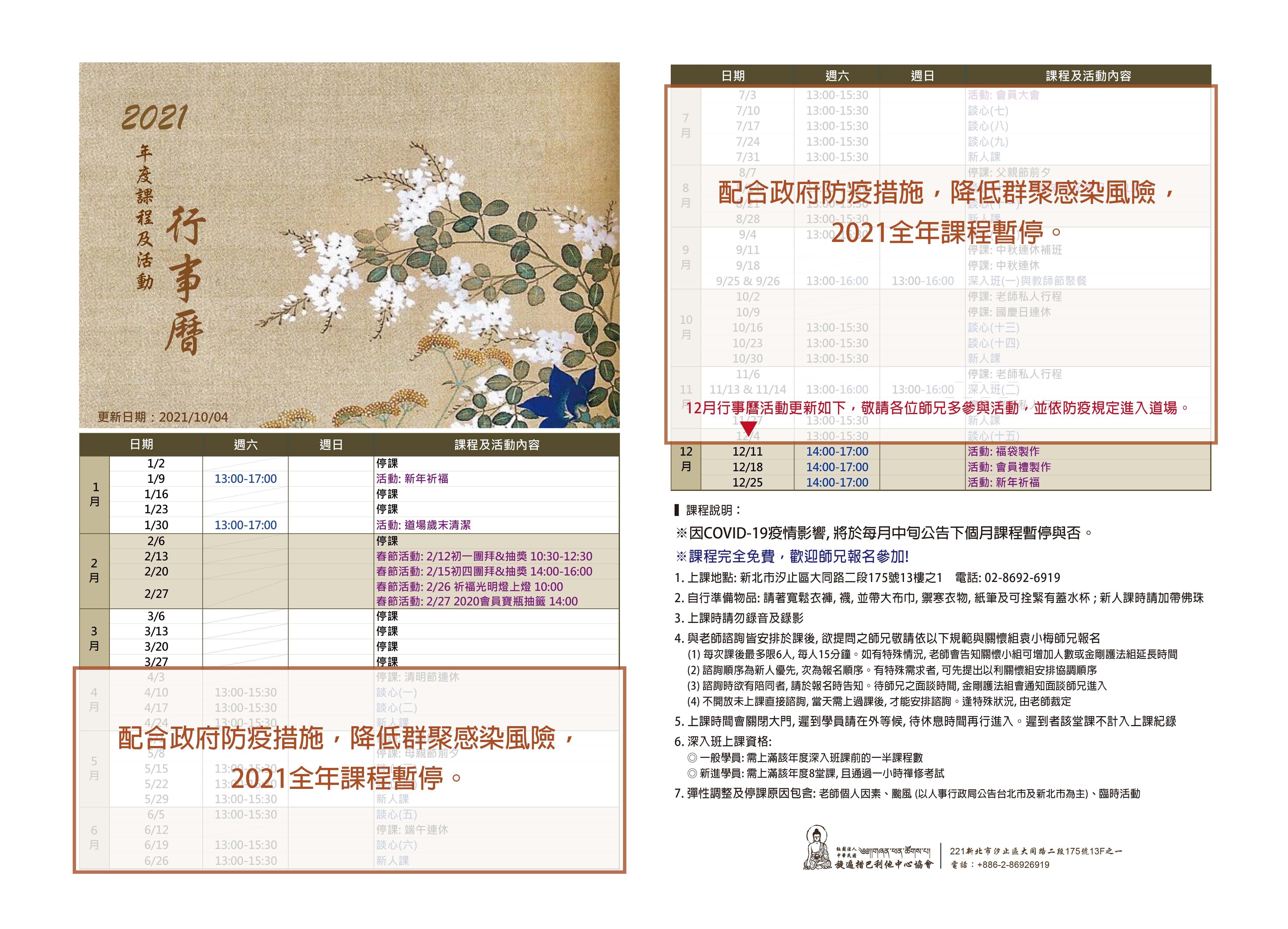 1. 各位師兄阿彌陀佛!為迎接新的一年,12月行事曆活動更新如下:12/11為福袋製作、12/18為會員禮製作、12/25為新年祈福活動,敬請各位師兄多參與活動,並依防疫規定進入道場。